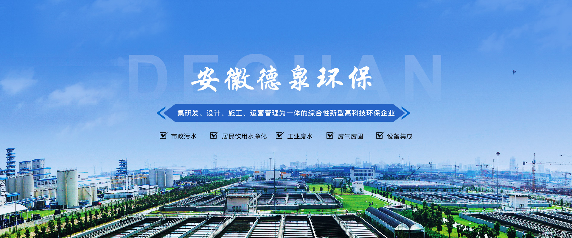 安徽德泉環(huán)保科技有限公司致力于廢水、廢氣、固廢技術(shù)處理研發(fā)、設(shè)計、施工及運營管理,從事環(huán)保設(shè)備及設(shè)施的制造和銷售,為環(huán)保項目系統(tǒng)提供專業(yè)的技術(shù)咨詢和服務(wù)。是一家集建筑勞務(wù)分包,工程總承包(EPC)、項目投資(BOT/PPP)、運營管理(O&M)于一體的綜合性新型高科技企業(yè)。